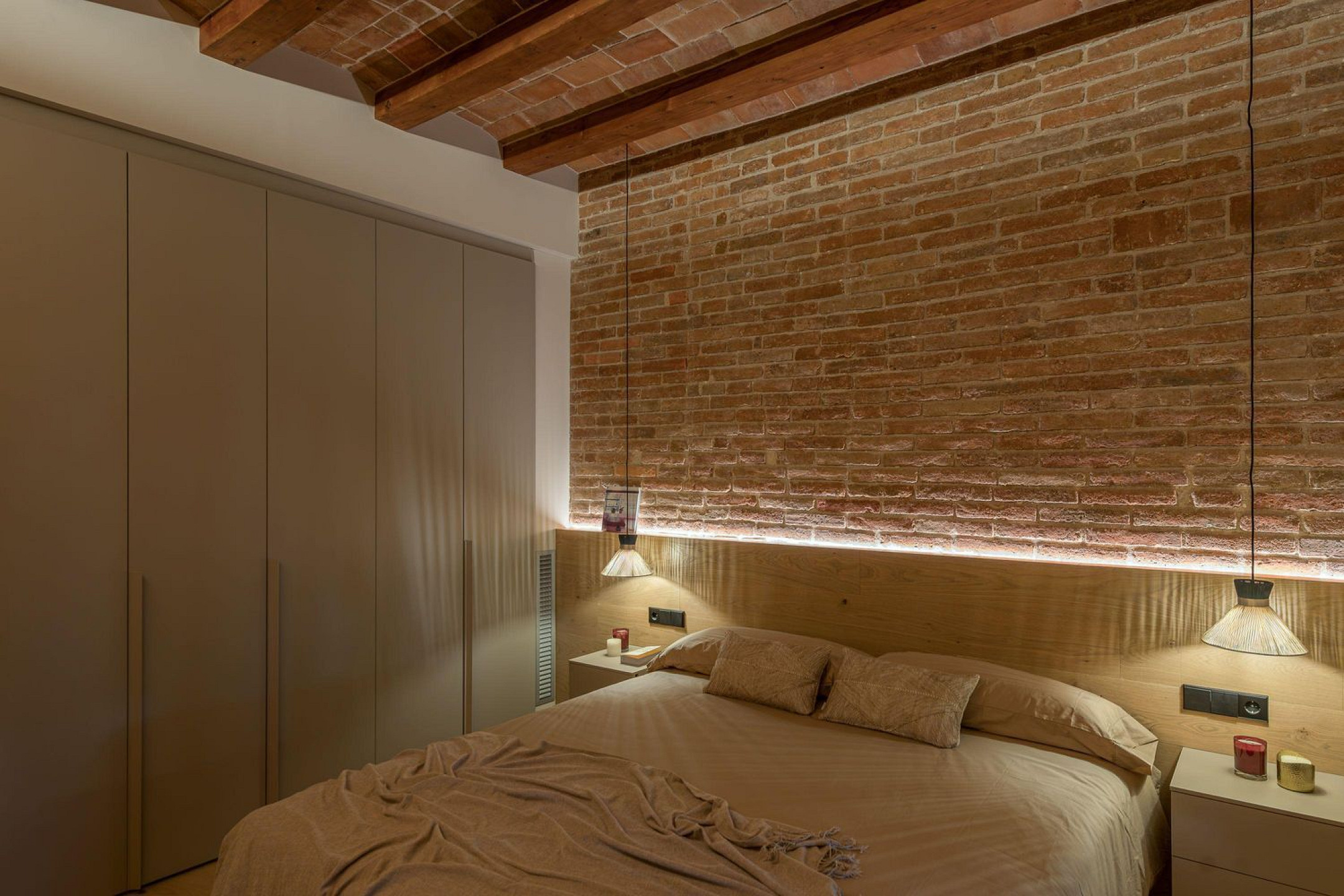La rehabilitación ha respetado y puesto en valor elementos originales como la volta catalana y los suelos hidráulicos pulidos, integrados a modo de alfombras dentro de una distribución contemporánea. Estos elementos dialogan con materiales de alta gama en carpinterías, armarios a medida, iluminación y electrodomésticos, generando una atmósfera sofisticada y atemporal.