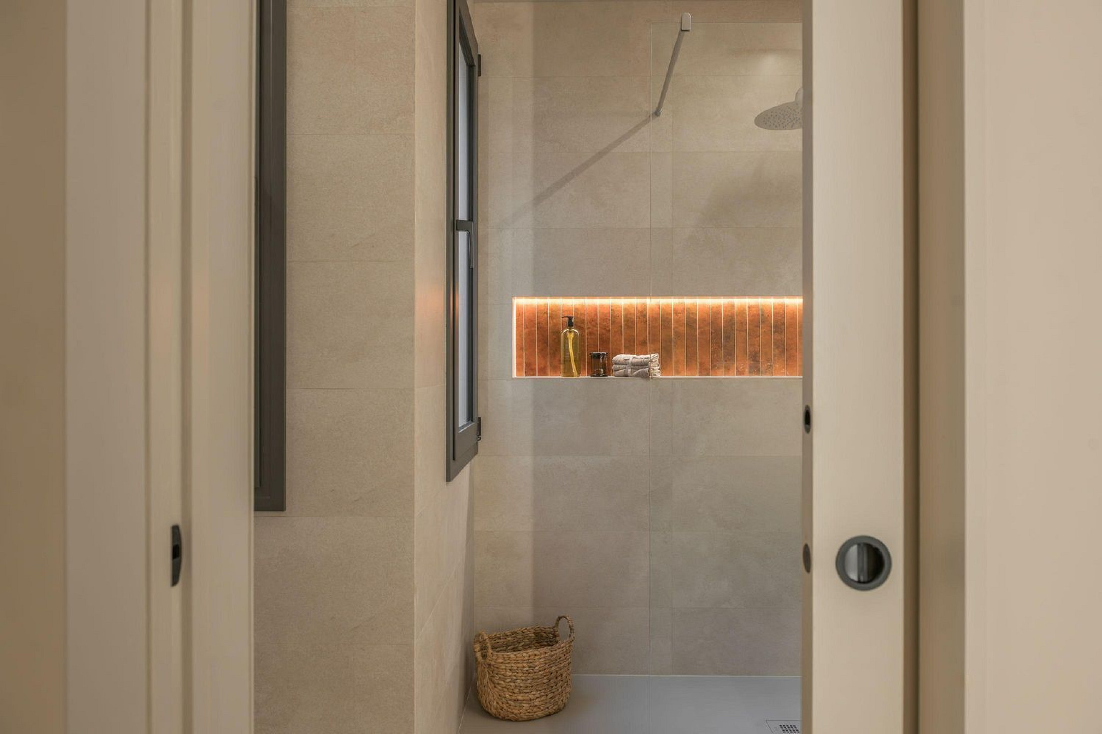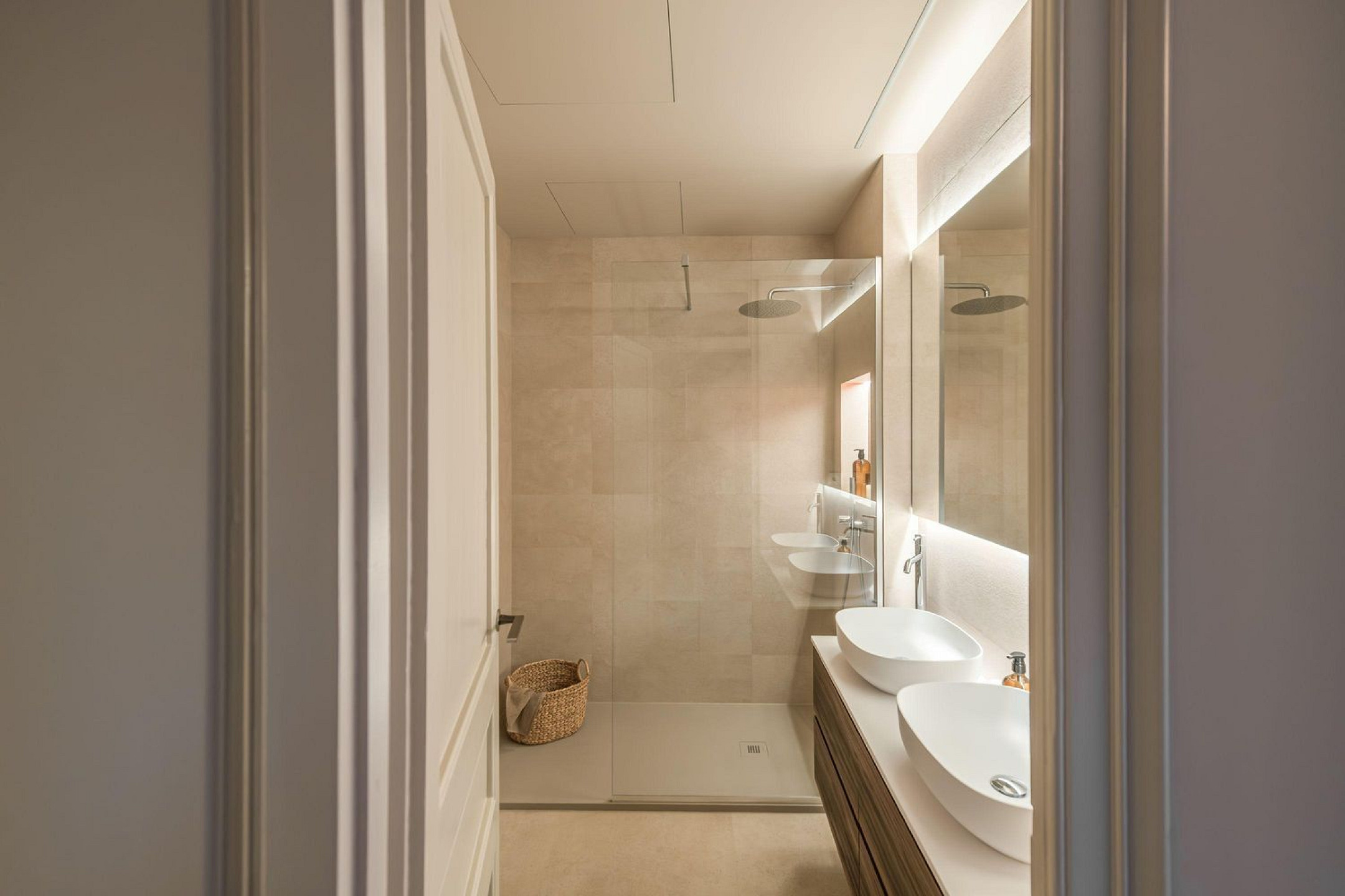 La zona de noche se articula en torno a dos amplios dormitorios dobles. El principal dispone de armarios empotrados, baño en suite y salida a un balcón francés, aportando luz natural y una agradable conexión con el exterior. El segundo dormitorio, de dimensiones y prestaciones equivalentes, se complementa con un baño completo independiente que también actúa como aseo de cortesía. Ambos baños han sido diseñados con una estética serena y envolvente, evocando la experiencia de un espacio de bienestar.