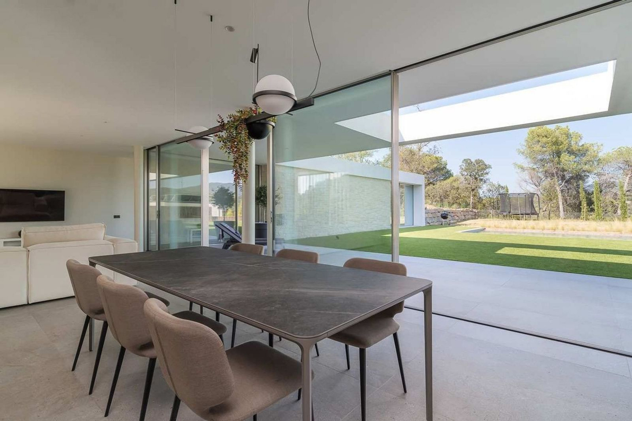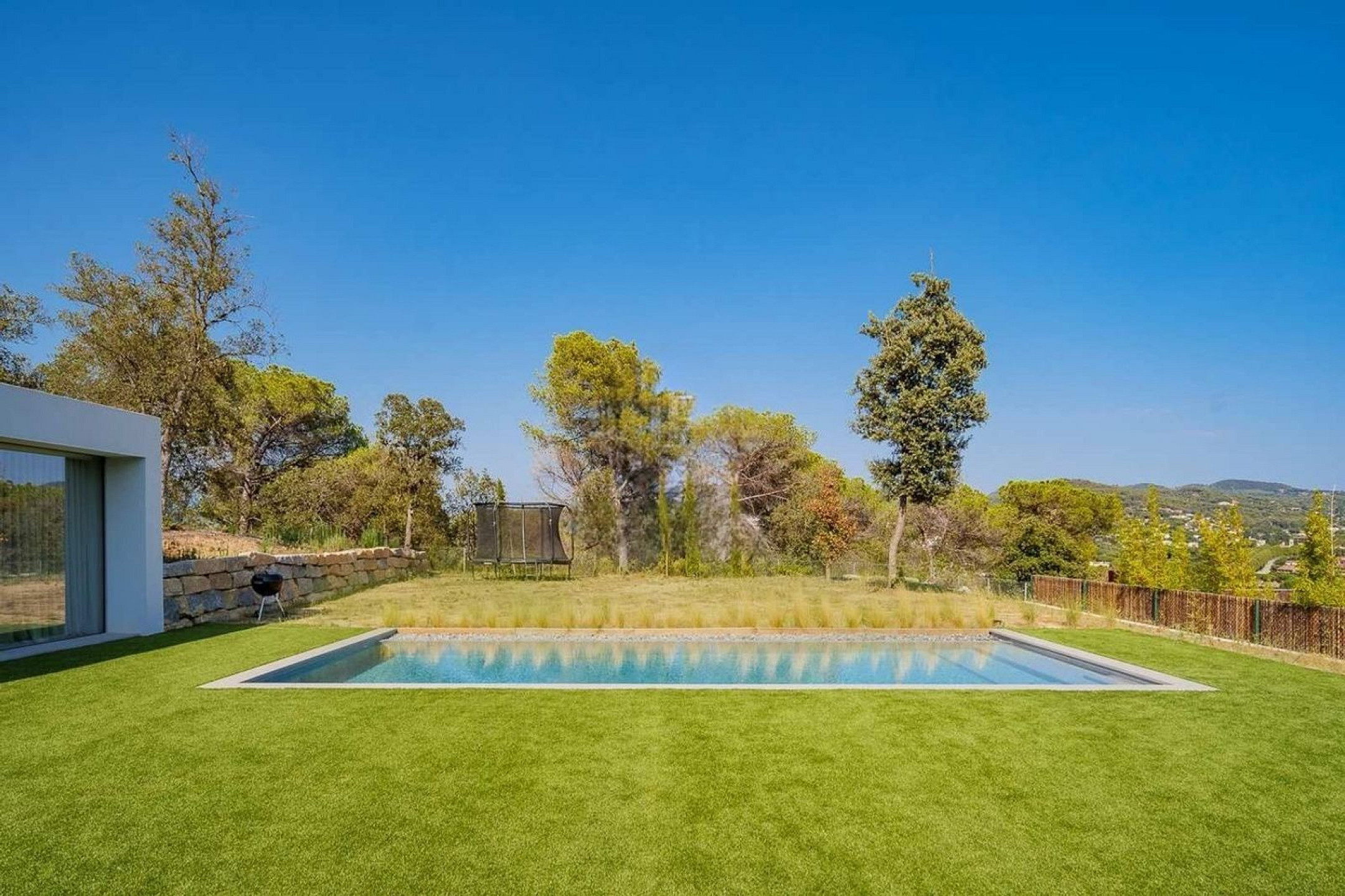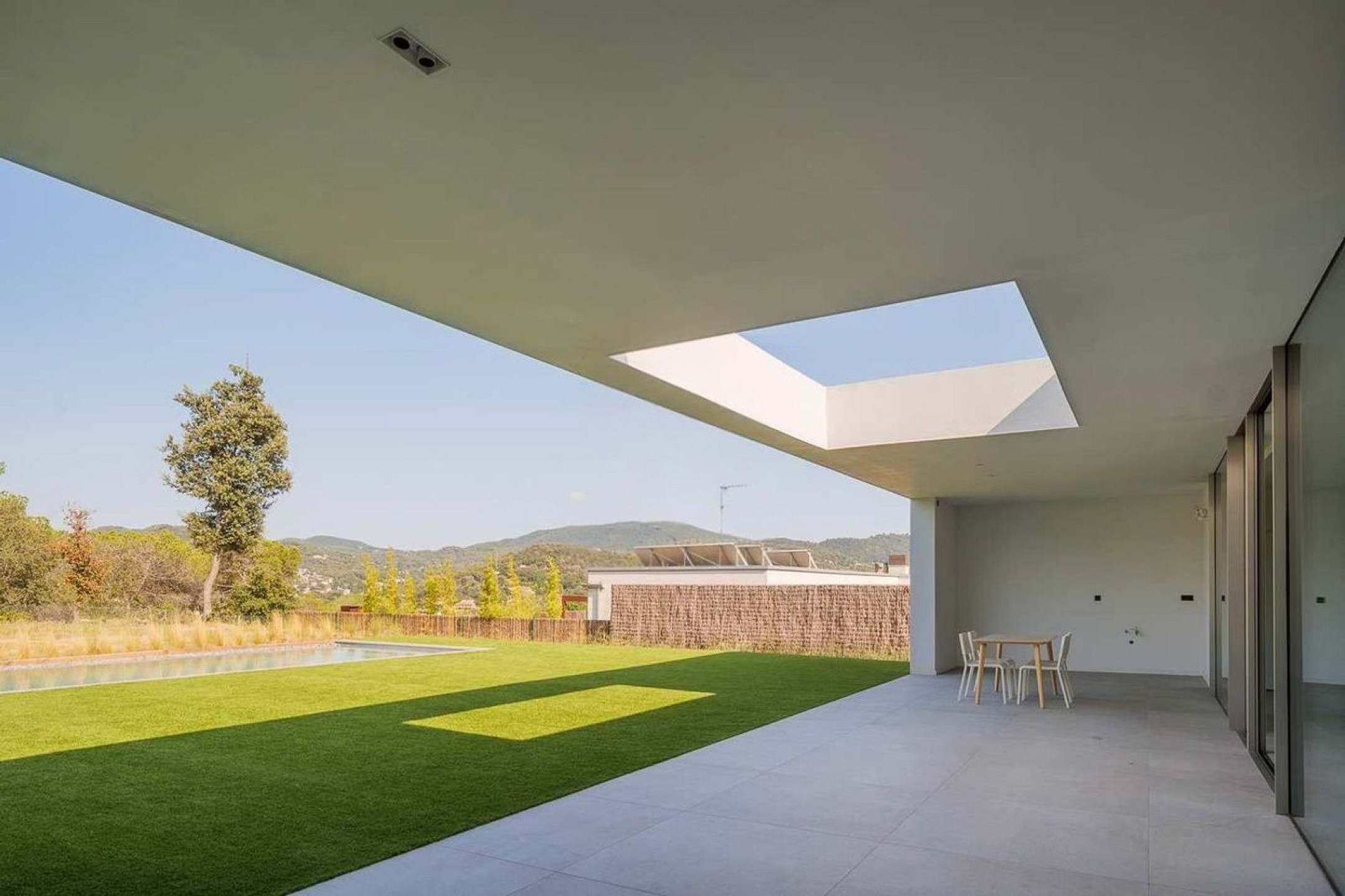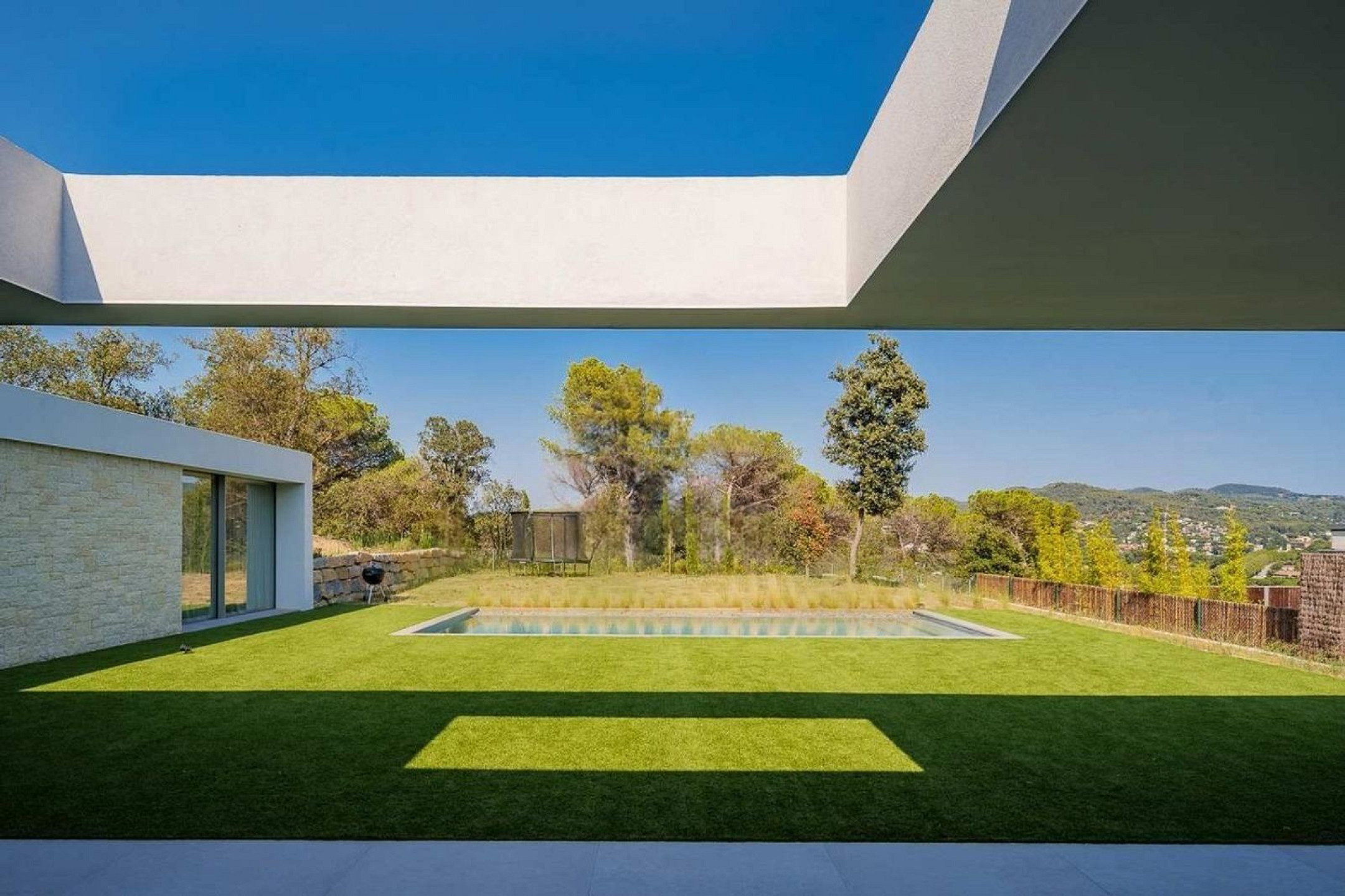 El porche cubierto prolonga el interior hacia el exterior y crea un espacio idóneo para comidas al aire libre o momentos de descanso. La piscina y el jardín, cuidadosamente diseñados, se complementan con una zona de barbacoa pensada para la vida social y el disfrute pausado.