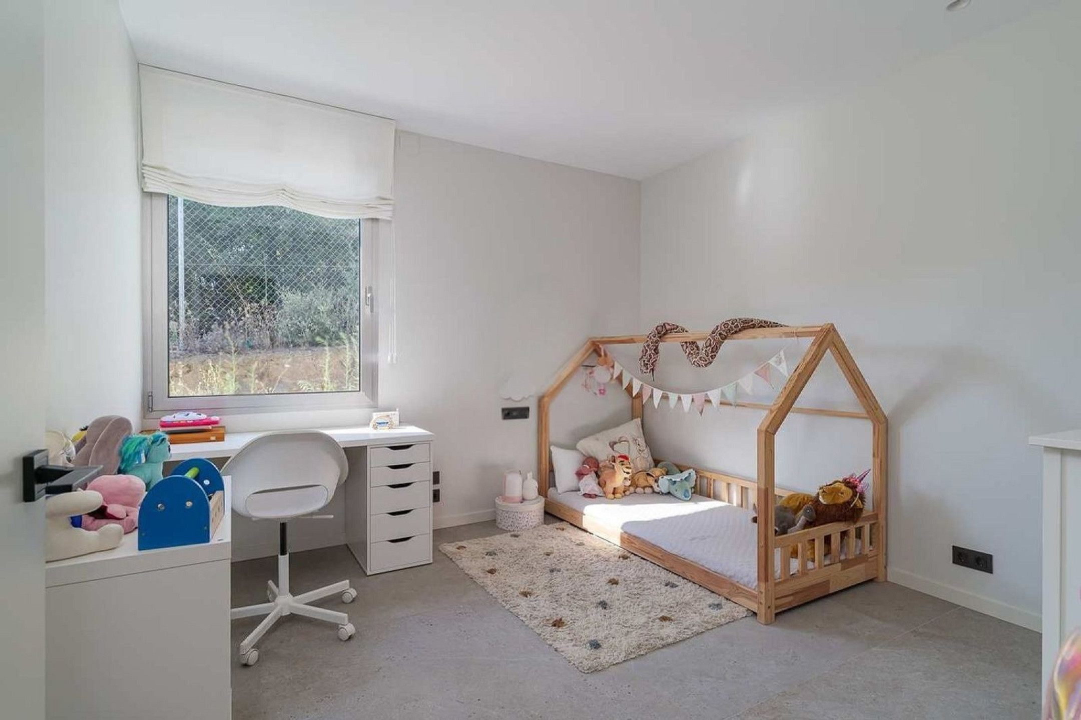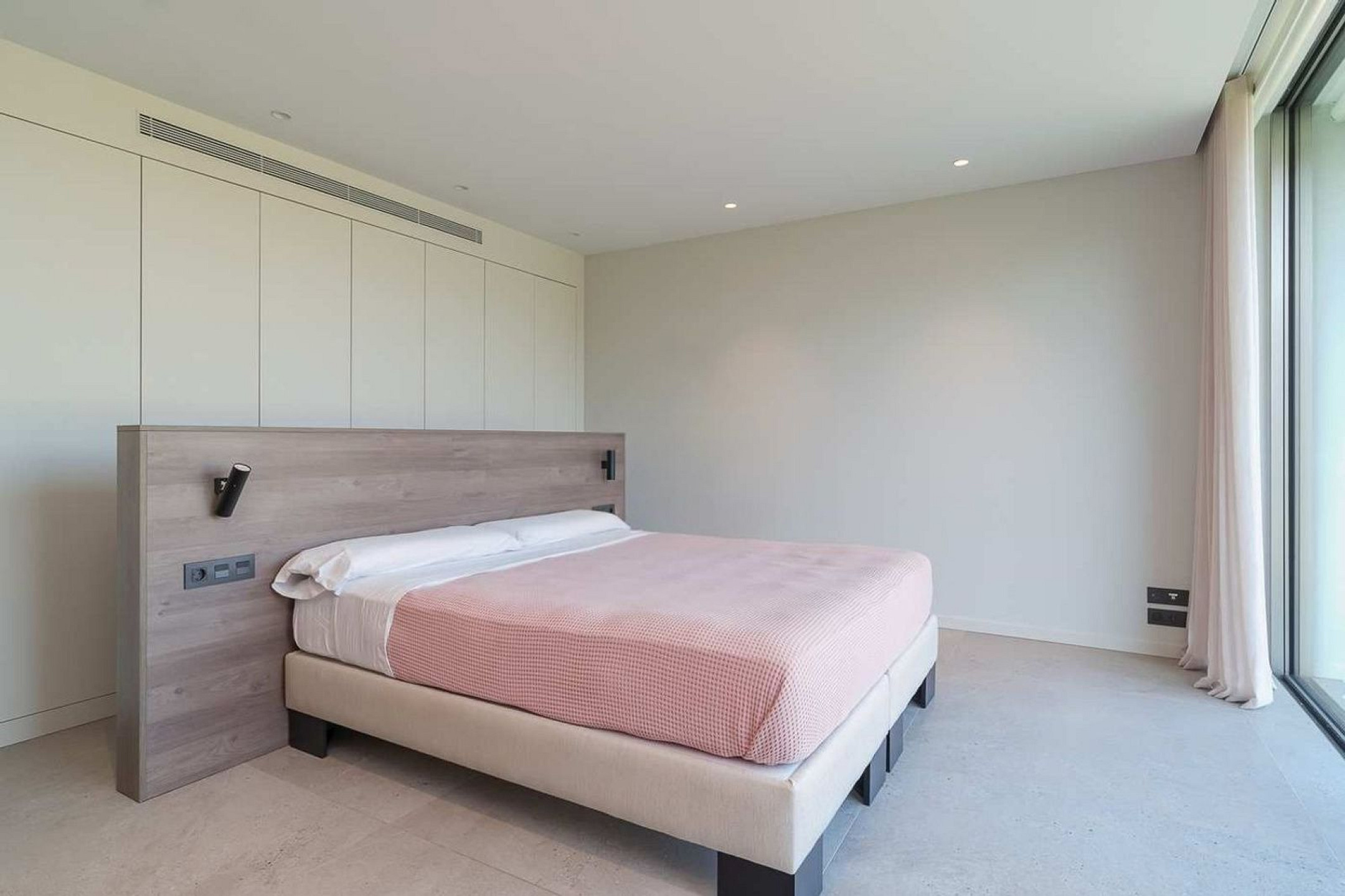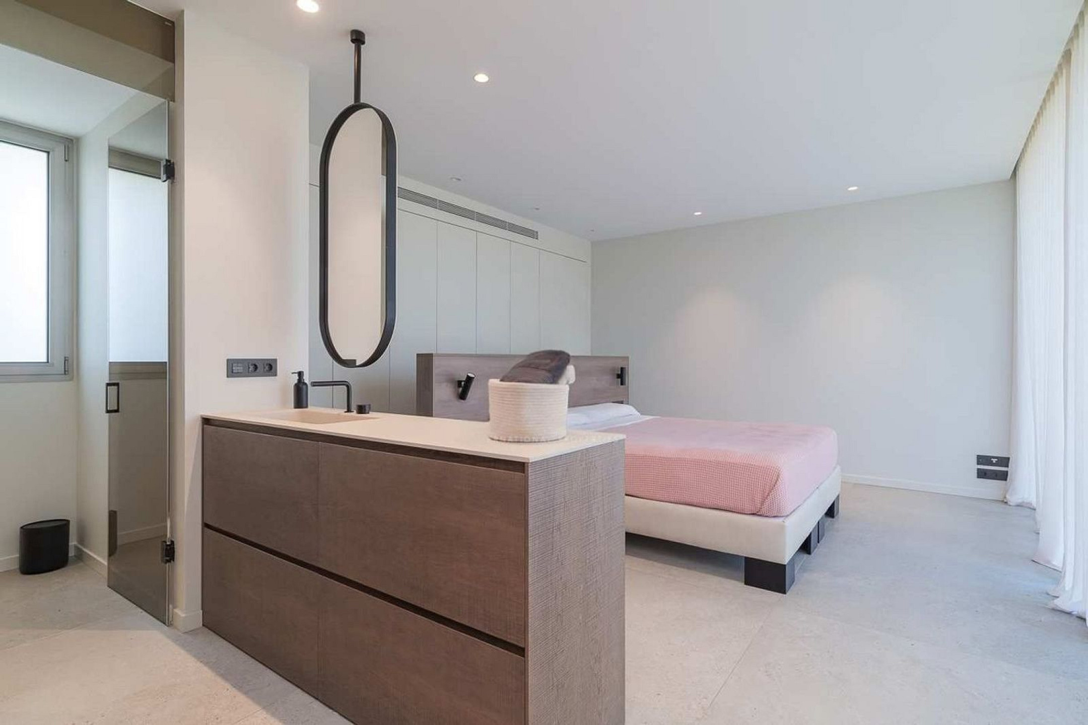 La zona de descanso se completa con dos dormitorios de amplias dimensiones que comparten un baño completo, y un dormitorio principal concebido como un espacio privado, con baño en suite y acceso directo al jardín y a la zona de piscina.