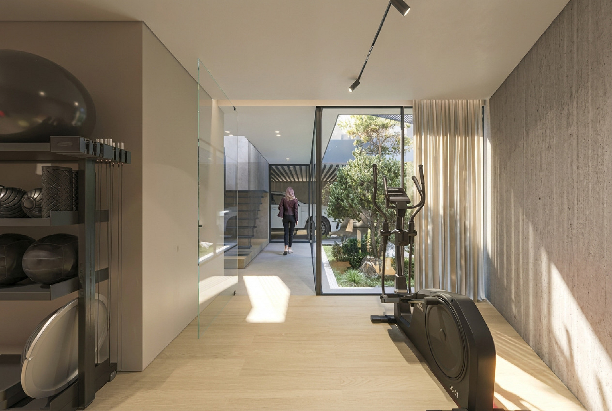 En la planta baja de esta impresionante residencia se encuentra un amplio garaje con capacidad para hasta cuatro vehículos. Además, cuenta con sala de máquinas, lavadero, trastero y un gimnasio completo para mantenerse en forma.