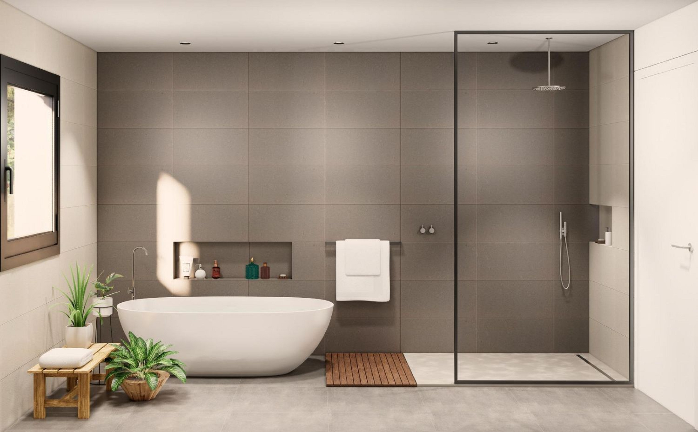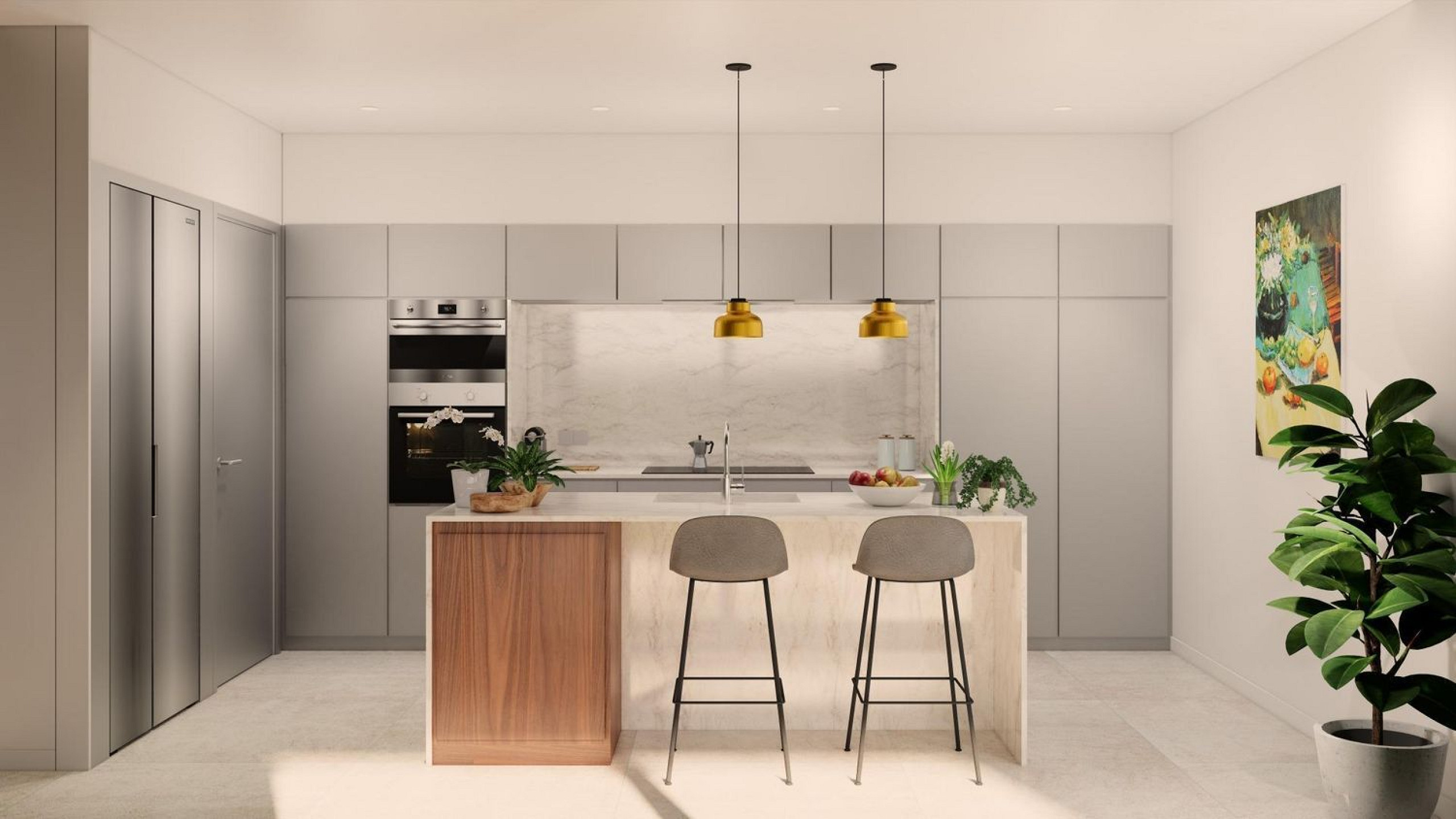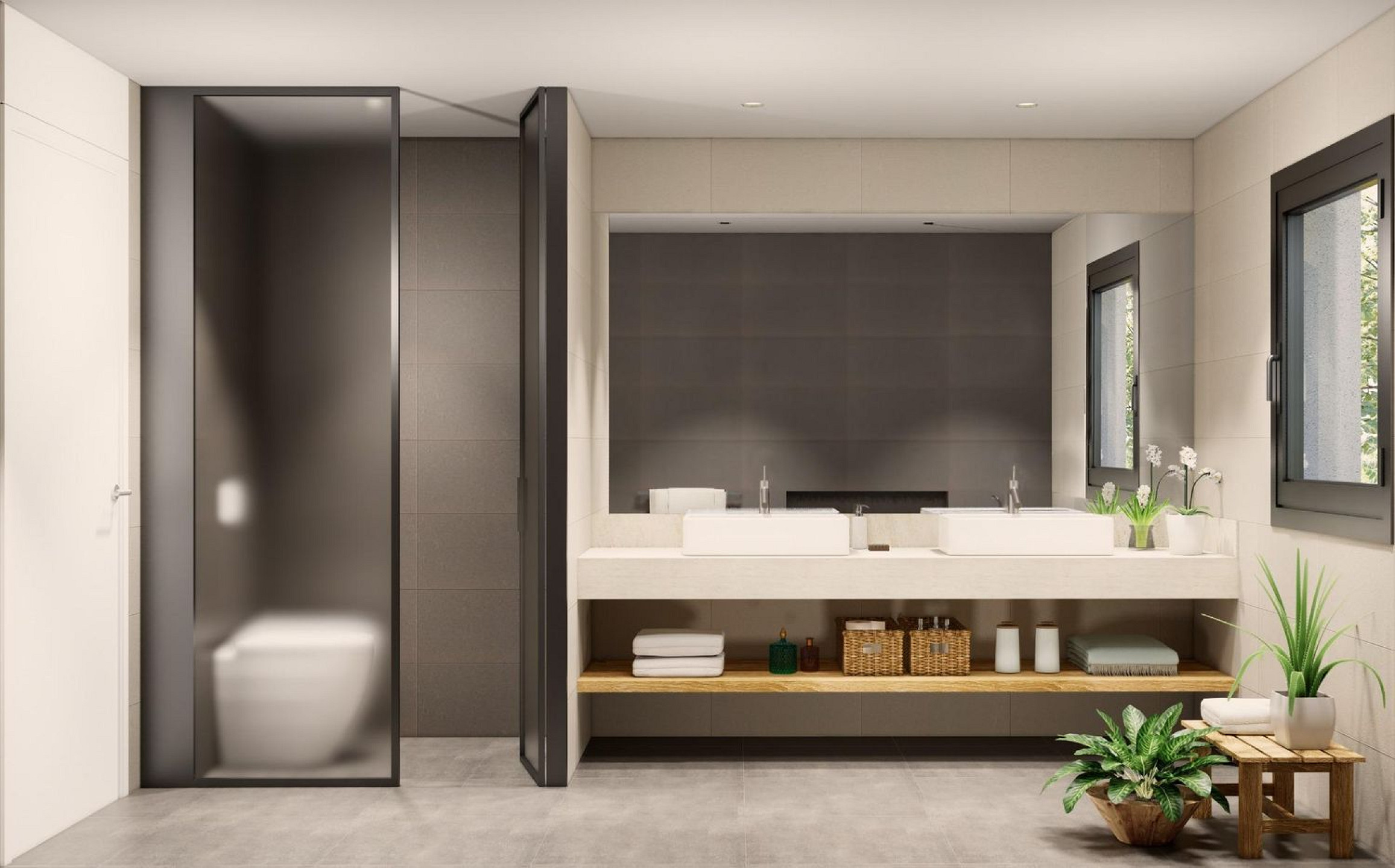 La distribución prioriza la funcionalidad y el confort. El área de día se articula en torno a un amplio salón-comedor con cocina integrada de concepto abierto, diseñado para favorecer la luz natural y la continuidad visual hacia el jardín. La zona de noche alberga una suite principal con vestidor y tres dormitorios dobles, pensados para un uso versátil y familiar.